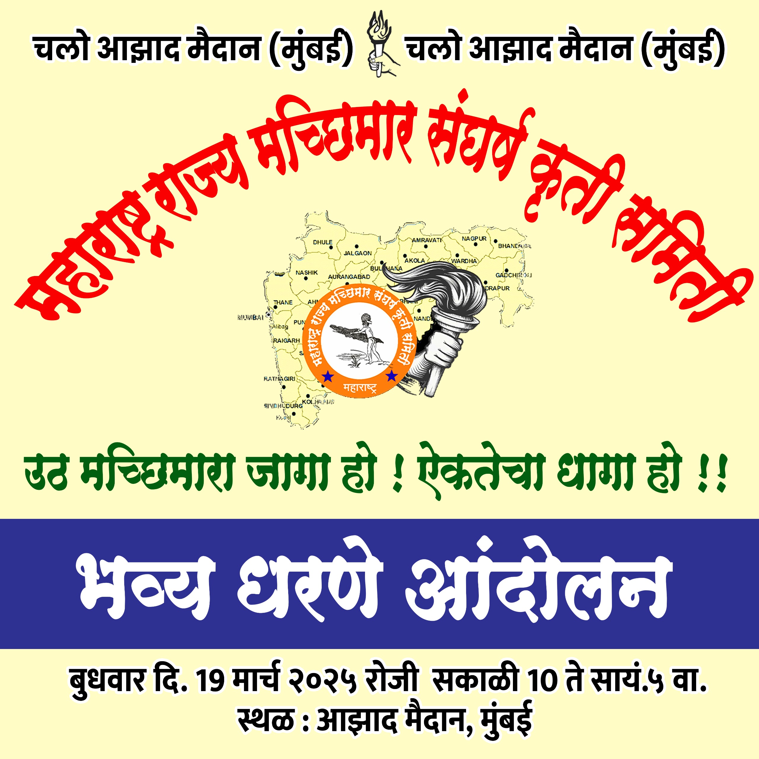 महाराष्ट्र सरकारने 12 मे 2023 चा मत्स्यव्यवसाय विभागाचा गोरगरीब मच्छिमाराकरिता काळा निर्णय ठरलेला शासन निर्णयावरिल बंदी उठवली म्हणून राज्यातील मच्छिरांमध्ये प्रचंड असंतोष निर्माण झाला आहे. तो त्वरित मागे घ्यावा म्हणून महाराष्ट्रातील मच्छिमार बांधव उद्या बुधवार दिनांक 19/03/2025 रोजी आझाद मैदानात एकवटणार आहेत.